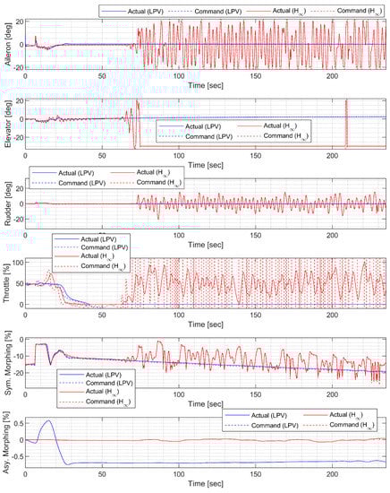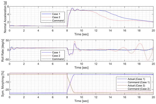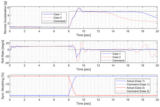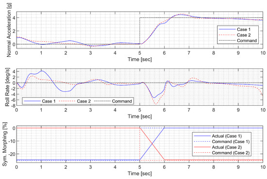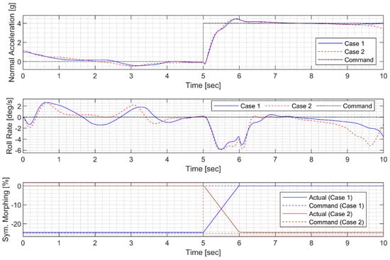 The aileron, rudder, and morphing actuator were modeled in the same way as in the CAS design. The reference weight was set to 30 deg for the roll angle command, and this condition can be forced in the guidance command. The ideal model for the AOS response to the command was set to have a natural frequency of 2 rad/s and a damping ratio of 0.8 to allow for some overshoot. The ideal model for the roll rate response to the command was set to have a natural frequency of 5 rad/s and a damping ratio of 0.8 to allow for faster convergence. Performance weights were set to ensure that the model matching error does not exceed two times the corresponding measurement noise level at low frequencies. The sensor measurement error was modeled as white Gaussian noise, and the standard deviation was set to match the sensor specifications of the GTM. In the actuator model, a disturbance of 0.01 deg was added below 0.5 rad/s to account for errors due to the dead zone, saturation, rate limit, and additional uncertainties arising from complex morphing mechanisms.