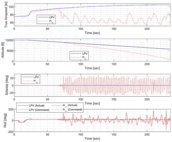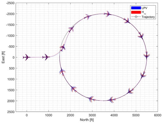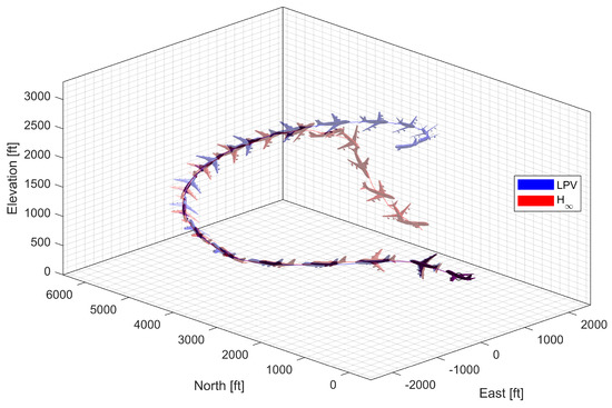 In spiral descent with morphing scheduling, the morphing UAV was commanded to follow a helical path with a radius of 2000 ft and a rate of descent of −20 ft/s, which corresponds to an approximate flight path angle of −8.98 deg. The symmetric morphing configuration was scheduled on the flight conditions so that the aerodynamic performance is improved. The resulting trajectory and state response are shown in Figure 29, Figure 30 and Figure 31. Note that the oscillation of the controller quickly loses stability even when the scheduling parameter undergoes gentle changes, whereas the LPV controller maintains the tracking performance.