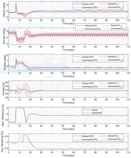 Note that the longitudinal motion is affected by symmetric morphing, whereas the lateral-directional motion is affected by asymmetric morphing. If the configuration where % is selected as a nominal configuration, the maximum variation in the aerodynamic coefficients becomes . The morphing parameters are suitable for the control input because they appear affinely in the forces and moments. The increments are nearly linearly proportional in the prestall region where deg, while the conventional control surface increments are only lightly affected by the AOA, as shown in Figure 4. Consequently, the control effectiveness of asymmetric morphing in the roll axis is low when the AOA is small. However, the effectiveness of asymmetric morphing becomes even greater than the ailerons in the poststall region ( deg), as shown in Figure 4. Furthermore, symmetric morphing can be used to delay stall in low-speed flights or high-g maneuvers by increasing the lift coefficient, which, in turn, decreases the AOA toward the prestall region while generating the same lift.