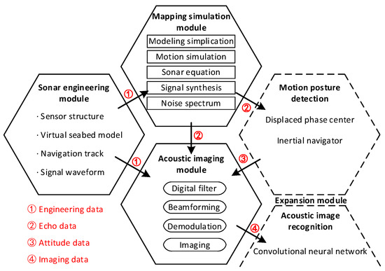 It is worth noting that the simulator has a modular network structure, which can be readily adjusted to fit other sonar systems. In particular, the two–level architecture facilitates the addition of new function modules. For example, currently, it is assumed that the sound velocity is constant; a ray–tracing submodule [39] can be added to the mapping simulation module to handle a depth–dependent sound velocity profile.