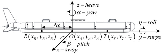 Figure 4 is the self–coordinate system established with the centroid of the sonar platform as the origin, in which the displacements along the axis are sway, surge, and heave, respectively, while the rotation angles around the axis are pitch , roll , and yaw , respectively. Let us denote as the transpose operation. The spatial position of the sensor can be calculated as