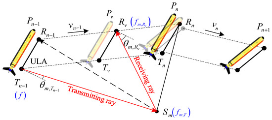 The doppler effect is also an inevitable problem in a high–speed acoustic mapping system, which refers to the signal frequency offset caused by the relative motion between the signal source and the receiver [35,36]. For the polyline path model in Figure 5, the frequency of the incident signal at the scattering point is