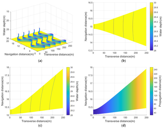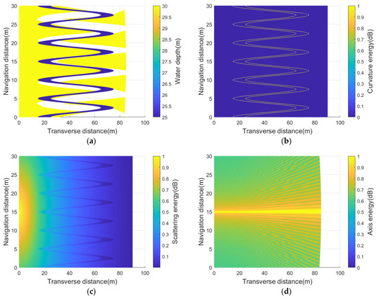 The receiving sensor () looks down horizontally at (0,10,30) coordinate: (a) the virtual seabed simplified by shadow coefficient ; (b) the curvature energy ; (c) the scattering energy ; (d) the acoustic axis energy .