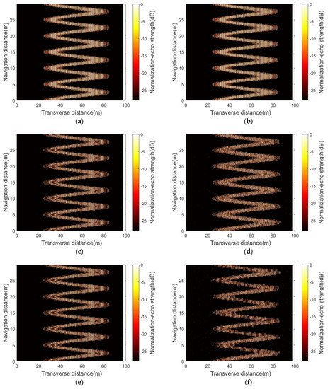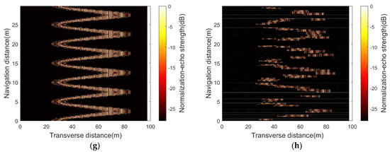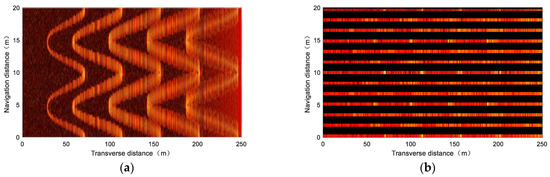 Simulation mapping images of the single–beam side–scan sonar used LFM signal as center frequency 400 kHz, bandwidth 30 kHz, and pulse width 5 ms: (a) at 3 knots; (b) at 10 knots.
