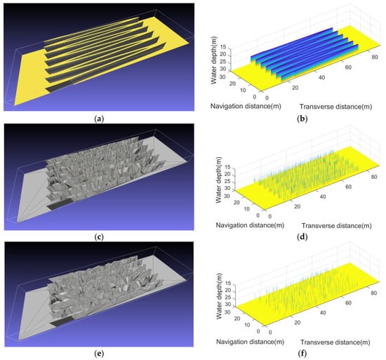 Figure 12 shows the simulation results under different simplification scales. Although the simplified TM can always maintain its original appearance, it is the visual effect of triangular faces pasting. However, such triangular faces are extremely inefficient in the echo signal fitting process and the point cloud extracted from the simplified TM is impossible to restore to the original model appearance. Therefore, the conventional energy function cannot simplify the virtual seabed in an underwater acoustic simulation.