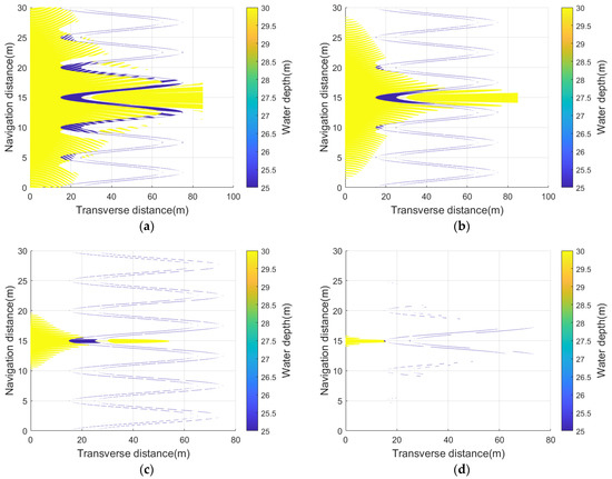 Generally, the receiving sensor is most sensitive to the scattering points near its acoustic axis. Thus, the axis energy is measured by the projection of the receiving beam in the scanning area. In practical applications, this new function needs to calculate the above energy components according to the real–time position of the sonar platform and the installation angle of the receiving sensor. For example, Figure 14 shows the simulation results under the same virtual model as Figure 12a.