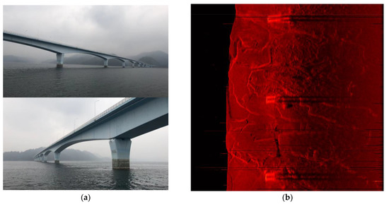 This section compares the simulation mapping results with the actual experiment to verify the fidelity of the developed sonar simulator. The mapping target is the pier of the cross–lake bridge and the sonar simulator loads the same engineering parameters of the tested single–beam side–scan sonar using LFM signal as center frequency 400 kHz, bandwidth 30 kHz, and pulse width 5 ms.