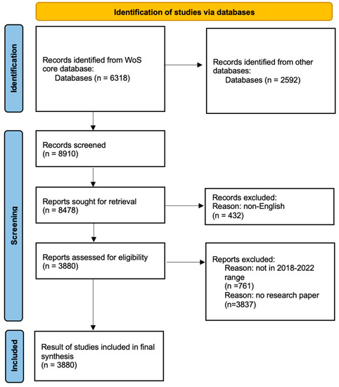 Besides the core collection database of WoS, this study included all databases in the WoS website (extracted on 9 January 2023), as well as Derwent innovation indexes, MEDLINE, the KCI-Korean Journal Database, the Chinese Science Citation Database, the BIOSIS Citation Index, the SciELO Citation Index, and the Food Science Resource (FSTA). The studies were selected using the Preferred Reporting Items for Systematic Reviews and Meta-Analysis (PRISMA) flowchart and guideline [23] as a filtering tool to select the papers from the WoS database. As shown in Figure 2, this bibliometric review progressed through the identification, screening, and inclusion of papers.