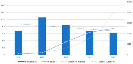 Upon filtering, we were able to find 3880 papers that were used to conduct the analysis of this study. According to the data, the total amount of time cited was 24,166; without self-citations, this value was 21,985. Furthermore, the average number of citations per item was 6.43, while the h-index of the collection was 57.