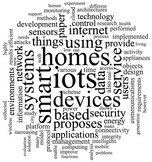 In the first analysis process, keywords that occurred with a high frequency in the WoS databases were provided by the authors of the paper. In terms of frequency, the most frequent keyword was “iots” with a 2.52% weighted percentage, the most similar keyword is “iot”, and the second most frequent keyword was “homes” with a 2.11% weighted percentage. The following are the next highest ranked keywords: “smart” (2.04%), “devices” (1.76%), “systems” (1.45%), “using” (1.45%), and “service” (1.21%). Figure 4 indicates the word cloud top 100.