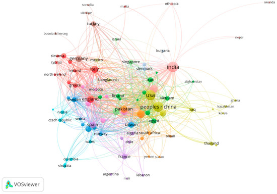 In terms of the co-authorship map of countries, it is important to note that 71 of the 107 countries on the co-authorship map of countries met the minimum threshold of five documents for co-authorship. Based on Figure 6, the number of documents provided by the USA was 588, and the number of citations was 2586 based on the number of documents provided. The total link strength was 266. There were 567 documents related to the People’s Republic of China, which were cited by 3046 other documents. The total link strength was 298. A total of 465 documents and 2267 citations were cited in India as the third major country. Together, these three countries showed a strong sense of partnership.