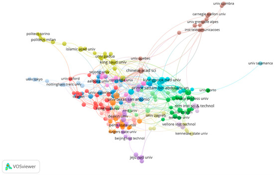 According to the data, Prince Sattam Bin Abdulaziz University had the strongest total link strength (39), while the Chinese Academy of Sciences had the second strongest total link strength (38) among all universities. University of Texas at San Antonio was the institution with the highest number of citations (326 citations). In addition to this, it can also be observed that the most active cluster of research relationships revolved around “Beihang University”, “Cardiff University”, “Carleton University”, “Dongguk University”, “Fudan University”, “Guangzhou University”, “Hongkong Polytech University”, “Nanjing University”, “National University of Science and Technology”, “Newcastle University”, “Peng Cheng Lab”, “Shenzhen University”, “Southern University of Science and Technology”, “Stevens Institute of Technology”, “Swinburne University of Technology”, “Temple University”, “Tsinghua University”, “University North Texas”, “University Oxford”, “University South Carolina”, and “Xi’an Jiaotong University” (13 institutions in total). This led us to conclude that highly educated researchers are working on the development of the IoT in homes worldwide.