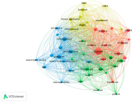 In this study, we chose all keywords as the unit of analysis, and we set 20 times as the minimum number of occurrences per keyword; therefore, 1997 out of 7693 words met the threshold that was expected to reach the top 100 words. In Figure 8, the co-occurrence analysis of the top 50 keywords is shown. The number of links was 1129 and the total strength of the links was 6439. In cluster one, 13 items were identified. These items had the following names: “actuator”, “algorithm”, “attack”, “challenge”, “communication”, “control”, “healthcare”, “home”, “number”, “researcher”, “scheme”, “smart city”, and “work”. The second cluster encompassed words such as “benefit”, “could”, “framework”, “home automation”, “life”, “patients”, “people”, “real time”, “year”, “smartphone”, “term”, “time”, and “variety” (13 items). A third cluster (13 items) comprised the concepts “architecture”, “concepts”, “implementations”, “information”, “interoperability”, “Internet of Things”, “needs”, “objects”, “platforms”, “smart devices”, “smart home environments”, and “smart home services”. The fourth and final cluster comprised “experiment”, “field”, “function”, “home appliance”, “industry”, “Internet of Things environment”, “development requirements”, “study”, “trend”, and “use” (10 items).