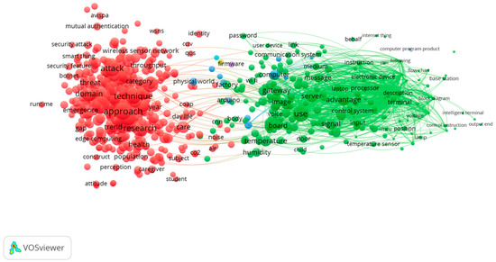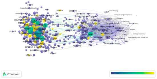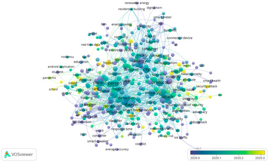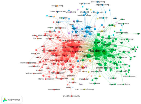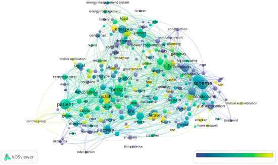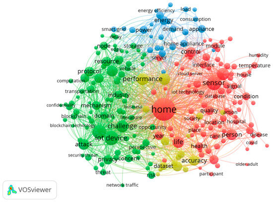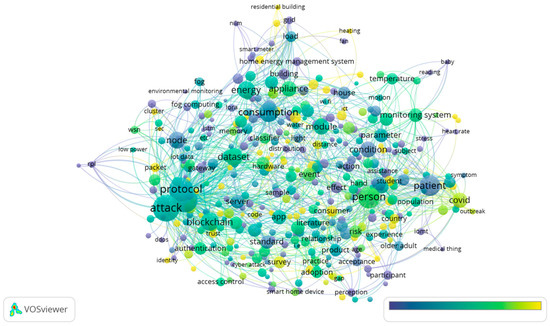 As can be seen from Figure 18 and Figure 19, the research theme for home IoT for 2022 is described in more detail. A total of 467 terms met the threshold out of 16,784 terms. In 2022, “home energy management system”, “home network”, and “home environment” were among the terms with high occurrences.
