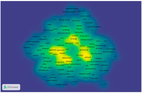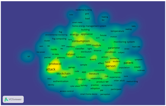 COVID-19 was still a concern in the field of home IoT research in 2022. “COVID” (68 occurrences, 1.23 relevance) and “pandemic” (58 occurrences, 1.02 relevance) were closely connected. Furthermore, “home” and “home automation” showed high occurrences and are located in the center.