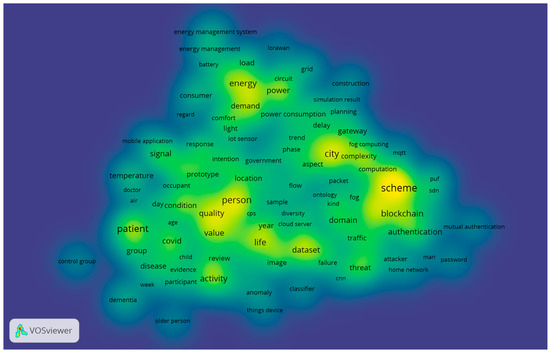 Taking a look at the terms, “scheme” had the highest number of occurrences (245), “person” was in second place with 216 occurrences, “patient” was third with 140 occurrences with 1.25 relevance, and “blockchain” was fourth with 113 occurrences and 1.21 relevance. There were also several items that were referred to as home items, such as “house”, “room”, “window”, and “sleep”. These items were co-occurring with the themes around “COVID”. As mentioned before, as people worked or studied “at home” due to the COVID-19 pandemic, a series of descriptive research was published by scholars about the application of the IoT in their homes.
