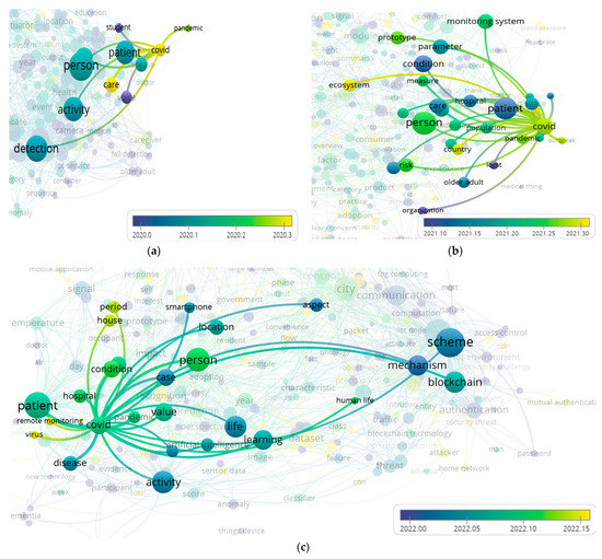 Topics related to COVID-19 in 2020–2022: (a) 2020, (b) 2021, and (c) 2022.