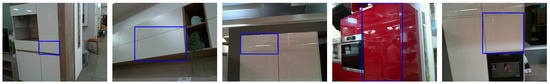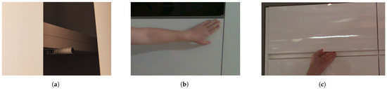 The following research considers handle detection [35,36,37,38,39]. In [36], the authors proposes automation of a door handle cleaning task. The cleaning process included door handle detection based on deep learning, which as a result provided the position of the handle to the robot. In order to improve nursing robots, in [35], identification of doorknobs and handles in images using machine learning was proposed as a preliminary step in the development of an autonomous mobile robot that can open and close arbitrary doors. In [37], the authors propose AI-driven wearable technology, which detects door handles and hand position of the visually impaired user and navigates them to the doorknob. To improve the efficiency of door recognition, in [38], the average height of doorknobs was used as the context feature. Two types of doorknobs were tested: straight (door handle) and round (doorknob). The considered handles in the above-mentioned papers are positioned somewhere on the outer surface of the door and thus visible. To the best of our knowledge, there are no existing methods for recognition of alternative door opening types, such as those with push mechanism and hidden handles, which we propose in this paper.