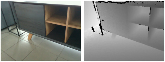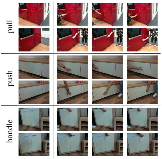 The RGB and the depth images were captured using the Robot Operating System (ROS) and saved as PNG files. The resolution of the images in the dataset is 640 × 480 pixels, and the RGB and depth images are aligned. A pair consisting of an RGB image with a corresponding depth image can be seen in Figure 2. Intrinsic camera parameters are included in the dataset. The dataset consists of three classes that differ in the way they are operated: push, pull, and handle. The push class describes doors without regular handles that need to be pressed on the front surface to open, while the pull class describes doors without regular handles that have some sort of indentation on one of the sides that provides space for fingers to grab and open the door. We also refer to the latter class as the hidden handle class. In contrast to the other two classes, the handle class represents room doors with a regular handle on the front. We divided the object instances into four categories of doors that can be opened: cabinet, closet, door, and drawer. Each object was captured from one or more viewpoints, but the number of viewpoints varies for each one. We also captured multiple images for each camera viewpoint. The first image represents the baseline image of the object without hands. The other images were taken from the same viewpoint but with hands grasping the interaction spots of the object. Interaction spots refer to spots on an object where the object can be opened. These can be a regular handle on the door, edges of the front surface of the door, or a part of the outer surface around which the push mechanism is located inside the door. The method of capturing the images with hands consisted of a person naturally and spontaneously touching or holding the interaction spots at various locations on the object, as if they were opening it on any given day. The information about the camera poses is not included in the dataset.