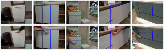 In addition, the class for each object was determined by opening the object. The Label Studio [63] data annotation platform was used for labeling. The images usually contain multiple doors, but only one was annotated, for which we use the term “relevant door”. The YOLO annotation format was used to export the bounding box annotations. For each image, a TXT file was created containing the object class, bounding box coordinates, and the height and width of the bounding box for the corresponding image. Figure 3 shows some examples of the annotations. The top row in the figure contains the baseline images with the corresponding bounding boxes, while the bottom row contains images taken from the same viewpoint but with a hand placed on interaction spots.