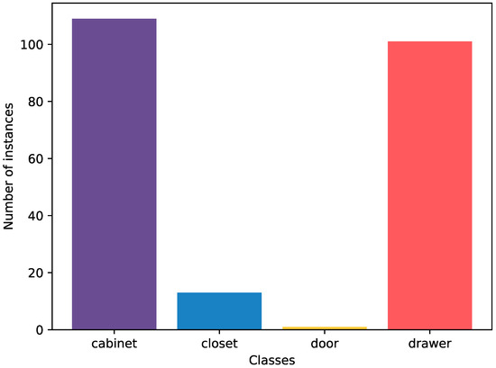 The distribution of object instances among categories can be seen in Figure 5. Of the total 224 object instances, 109 instances are in the cabinet category (1224 images), 101 in the drawer category (1208 images), and 13 in the closet category (124 images), while the door category, which includes room doors, has 1 instance (15 images). The closet and door categories have a small number of instances because there are not many instances that belong to the push or pull classes. However, cabinets and drawers are much easier to find in homes, and the various designs of these categories make it easier to capture a lot of diverse data. In addition, the object categories are not relevant to this research, as we only focus on the door opening types. Nevertheless, the information about the object categories is provided in the dataset for other potential users who might find it useful.