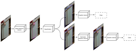 In this paper, we present a method for classification of furniture door opening types, a diagram of which is shown in Figure 7. Even though our dataset consists of RGB and depth data, we utilize only the RGB data for this method. As previously mentioned, we consider three types of handling: regular handles (handle), hidden handles (pull), and push mechanisms (push). Our goal is to identify regions of RGB images representing doors or drawers of cabinets and classify these regions into one of these categories. We consider two types of images: those with a human hand demonstrating the opening type and those without. First, an object detection network is used to detect a region of interest (ROI) in a given image. This ROI is then squarified and, in the case of no human demonstration, fed to a classifier CNN to determine the class of the door or drawer. In the case with human demonstration, the squarified ROI is first fed to a hand pose detection network that outputs heatmaps—sometimes referred to as belief maps or confidence maps in the literature—for hand keypoints, and these heatmaps are fed to a classifier CNN to determine the class. While any object detection network can be used for our method, a hand pose detection network that outputs the aforementioned heatmaps is needed. For this purpose, we use OpenPose [1].