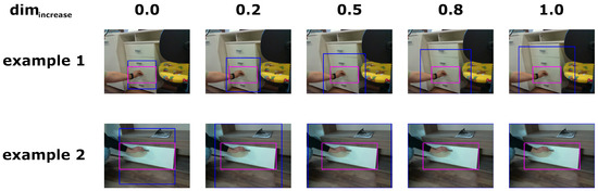 Examples of squarification with different values of . The ground truth bounding boxes are shown in magenta, while the squarified bounding boxes are shown in blue.