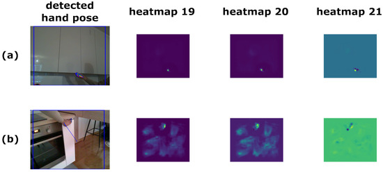 Two examples of results from hand pose detection using OpenPose. In (a), a well predicted hand pose is shown, while in (b), a poorly predicted hand pose is shown. When the predictions are good, heatmaps #0–20 have well defined keypoints.