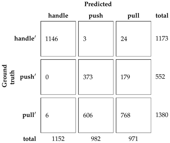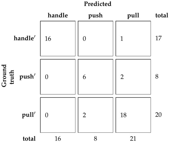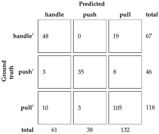 To test whether the classes can be reasonably predicted using only RGB images, we created a survey that asked participants to classify 45 furniture instances with doors from the test set into one of the three classes. The test set is the same one used in the previous experiments. They were given the whole image without the ROI and the whole image with the ROI highlighted. A total of 69 people participated in the survey and achieved an accuracy of 73.66%. The confusion matrix for this experiment is shown in Figure 13. If, however, we consider the participants as voters and, for each image, we take their most voted answer as their prediction, they achieve an accuracy of 80%.