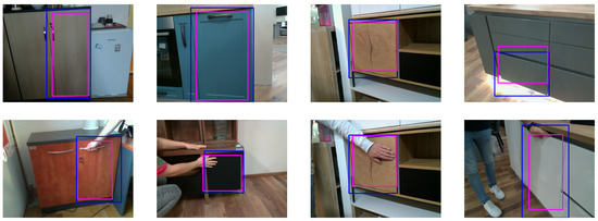 Since we only label one furniture instance per image, we are only concerned with the recall on our dataset. We consider any bounding box classified as door, cabinet door, or fridge door with 0.5 IoU or higher, with our ground truth bounding box as a true positive. A few examples of ground truth ROIs and positive predicted ROIs are shown in Figure 14.