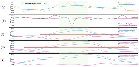 (a) Earth Y acceleration signal and its conversion to medio-lateral acceleration. (b) Earth X acceleration signal and its conversion to anterior-posterior acceleration. (c–e), represents the signals unified (module) by the algorithm at 20%, 30%, and 40% Smoothing + Minimum intensity peak (PmI) 0.8 G respectively. The orange bar indicates if the algorithm has detected COD and its duration (length of the bar).