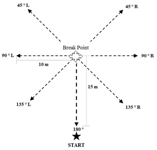 The test was carried out on an artificial-turf soccer field, with the participants wearing specific soccer boots for that surface. The CODs were repeatedly performed at different angulations and speeds, using a circuit previously used [28] (Figure 3). The participants were instructed to perform a 15 m linear run down a marked line on the soccer field. The researcher, aided by a stopwatch, performed a 3 and 5-s countdown (13 and 18 km/h, respectively) as a reference time in which the breaking point had to be reached in order to do the corresponding COD (Figure 4). In this way, in an attempt to ensure a constant speed in all the repetitions in the test. For a better understanding of the test, the participants were required as a warm-up to do a COD at both speeds in each direction (45°, 90°, 135° and 180°) both to the left and to the right. To carry out the test, each participant performed 5 CODs towards each angle both to the left and to the right at a speed of 13 km/h (Total participant = 40 CODs; Total group = 200 CODs) and 4 CODs at a speed of 18 km/h (Total participant = 32 COD; Total sample = 128 COD). To avoid possible fatigue interference in the dynamics of the test, the participants rested for approximately 60 s between each repetition.