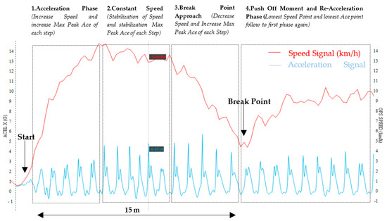 X-Axis Acceleration Channel (blue) and velocity (red) during the course of a COD at 45° at 13 km/h. Different biomechanical phases of a COD.