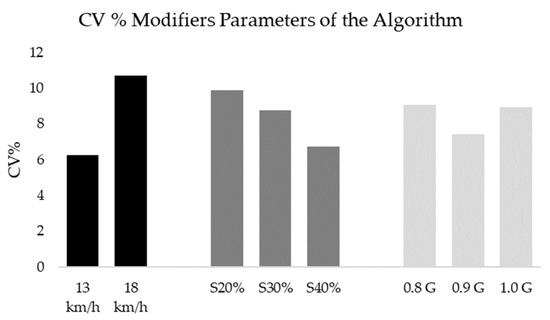 Table 2 shows the mean and standard deviations of video recording and the combinations for the three IMMUs. After a video analysis, participants averaged 38.4 ± 3.6 COD at a speed of 13 km/h and 31.2 ±3.7 COD at a speed of 18 km/h. The ICC test showed a reproducibility level of 0.94 (0.86–0.99) when the algorithm combinations processed the sample at 13 km/h and 0.96 (0.89–0.99) when it was processed over 18 km/h. Figure 5 shows the coefficients of variation between the IMMUs when all the combinations were grouped together with modifier parameters and speed. The results show a lower %CV between devices when all the combinations were pooled at 13 km/h (%CV = 6.5%), a % smoothing of 30% (%CV = 7.9%), and a minimum peak intensity of 0.9 G (%CV = 7.9%).