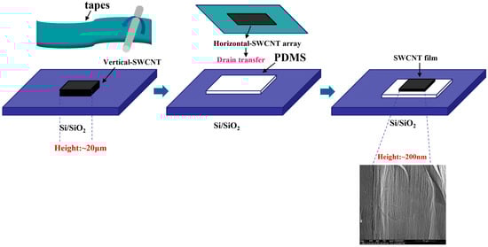 The height of the CVD-grown CNT arrays was approximately 20 μm. The as-obtained material was prepared into a thin film structure by rolling the sample with a smooth roller under certain pressure conditions and then transferring it onto a tape. In this way, it can be transformed into a horizontal alignment from vertical alignment, transferred onto a substrate (Si substrate with 285 nm SiO2 layer) using a dry method, and then transferred onto a slide affixed with PDMS using a dry method [,]. The fabrication process for CNT bundles in a laterally aligned formation is shown in Figure 1.