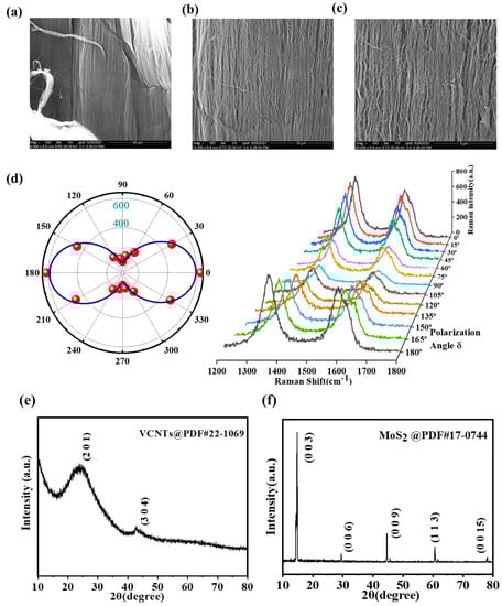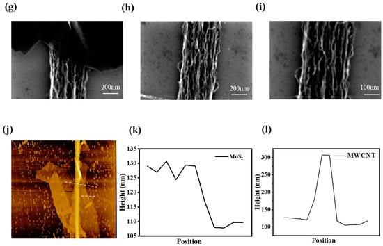 The obtained MWCNTS were first characterized by SEM—the SEM images in Figure 3a–c show a highly ordered arrangement of CNTs—and then we tested them with Raman polarization spectroscopy. The polar diagram of the Raman G-peak maximum intensity of the CNT bundles given in Figure 3d similarly confirms the orientation of the CNT that we obtained []. To confirm the phases of the vertically grown multi-walled carbon nanotube (MWCNT) arrays and MoS2 material, X-ray diffraction (XRD) tests were carried out, and the results are shown in Figure 3e,f. The obtained XRD pattern of the CNT conforms to the standard card PDF #22-1069, where the main peaks of the bare CNT appear at 2θ = 23.9° and 43.0°, corresponding to its (201) and (304) planes, respectively. As for the MoS2 bulk material, the XRD pattern exhibits peaks at 14.5°, 29.3°, 44.5°, 60.5°, and 77.9°, which can be ascribed to the (003), (006), (009), (113), and (0015) planes, respectively, when compared to the standard card PDF #17-0744. Figure 3g shows the image of the obtained heterogeneous structure under scanning electron microscopy (SEM) at different magnifications. Figure 3j shows the AFM characterization of this sample, and the results show that the surface of the sample is relatively homogeneous, where the thickness of MoS2 is approximately 20 nm for multilayer MoS2, whereas the thickness of MWCNT is approximately 200 nm.