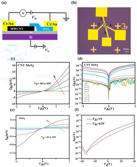 (a) Schematic diagram of a representative device; (b) optical image of the device with electrodes 1 and 2 in contact with CNT and electrodes 3 and 4 in contact with MoS2; (c) transfer characteristics of the heterostructure devices at different gate voltages; (d) corresponding logarithmic plots of the transfer curves; (e) transfer characteristics of MoS2 device at different gate voltages; (f) transfer curves of MoS2 at 0.5 V and 1 V bias voltage, respectively. Notes: ((c,e) the missing curves overlap at the 0 axis).