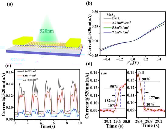 (a) Schematic illustration of the bare MoS2 photodetector; (b) Ids-Vds curves of the bare MoS2 photodetector at Vg = 0 V with different laser powers at Vds = 0 V; (c) Ids-Vds curves of the bare MoS2 photodetector at Vg = 0 V with different laser powers at Vds = 0.01 V; (d) variation in the device response time at Vds = 0.01 V with an optical power of 5.8 mW/cm2 illumination.