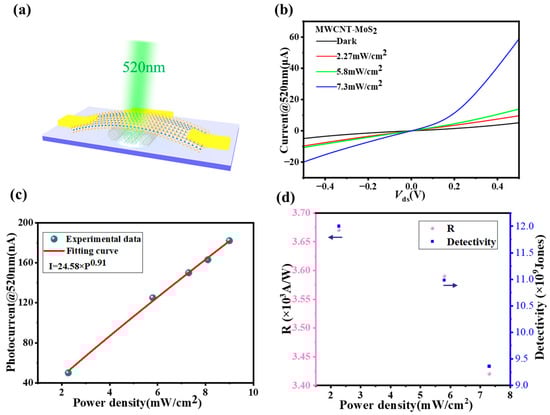 In conclusion, we demonstrated a hybrid dimensional heterostructure based on directionally aligned MWCNTs with MoS2 for a high-sensitivity photodetector, which was successfully prepared using a micro-nano fixed-point transfer technique. We found that the heterostructure device can observe stable optical response waveforms in a wide wavelength range from visible (520 nm) to near-infrared (1060 nm), demonstrating a nanomaterial-based heterostructure in which the advantageous properties of the components are combined to substantially improve the device properties. The photodetector provides a clear optical response when irradiated by laser light in the environment, and shows light-sensing capability at various power intensities and wavelengths. The device fabrication method is convenient and easy to control, which makes it a promising candidate for low-cost photodetection.