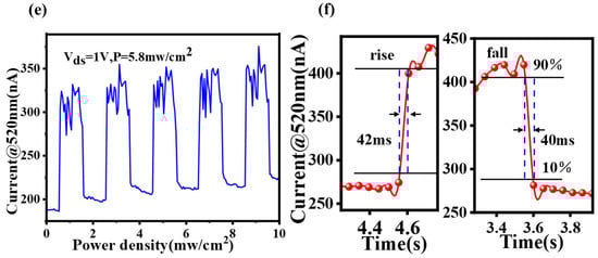 By increasing the power of the incident light at 520 nm, the number of photogenerated carriers in the channel is increased correspondingly, so the magnitude of the photocurrent shows a linear enhancement when increasing the incident light power (Figure 7c), which is consistent with the relationship between Iph and incident power: