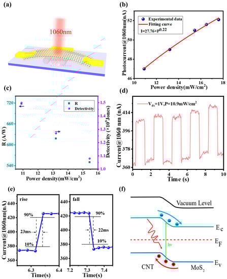 (a) Schematic illustration of the device under NIR (1060 nm) laser irradiation; (b) photocurrent vs. power density of the MWCNT-MoS2 heterostructure photodetector device at Vg = 0 V and Vds = 1 V; (c) variation in detection rate and responsiveness at different optical power densities; (d) variation in device response time at Vds = 1 V with an incident power of 10.9 mW/cm2 illumination; (e) time-resolved photoresponse, where the rise and fall times of the photocurrent are approximately 23 ms and 22 ms, respectively; (f) energy band diagrams of CNT/MoS2 vdW heterostructures in the light.