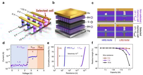 - Sun, L.; Zhang, Y.; Han, G.; Hwang, G.; Jiang, J.; Joo, B.; Watanabe, K.; Taniguchi, T.; Kim, Y.-M.; Yu, W.J. Self-selective van der Waals heterostructures for large scale memory array. Nat. Commun. 2019, 10, 3161. [Google Scholar] [CrossRef]