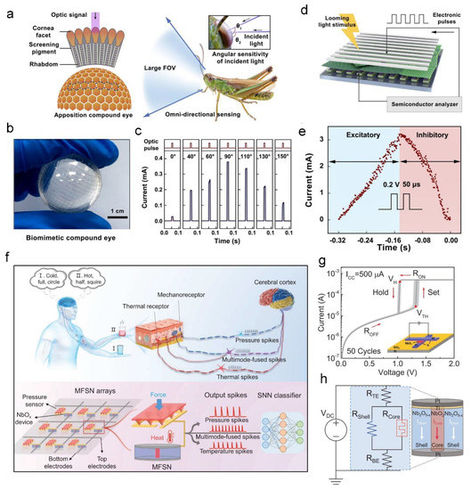 - Wang, Y.; Gong, Y.; Huang, S.; Xing, X.; Lv, Z.; Wang, J.; Yang, J.-Q.; Zhang, G.; Zhou, Y.; Han, S.-T. Memristor-based biomimetic compound eye for real-time collision detection. Nat. Commun. 2021, 12, 5979. [Google Scholar] [CrossRef]