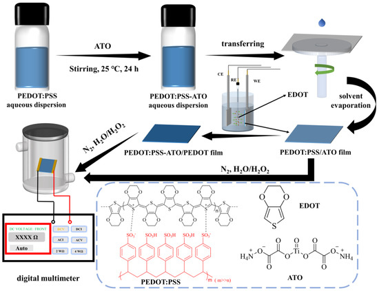Schematic of the preparation and detection process of PEDOT:PSS-ATO and PEDOT:PSS-ATO/PEDOT films. CE: counter electrode; RE: reference electrode; WE: working electrode.