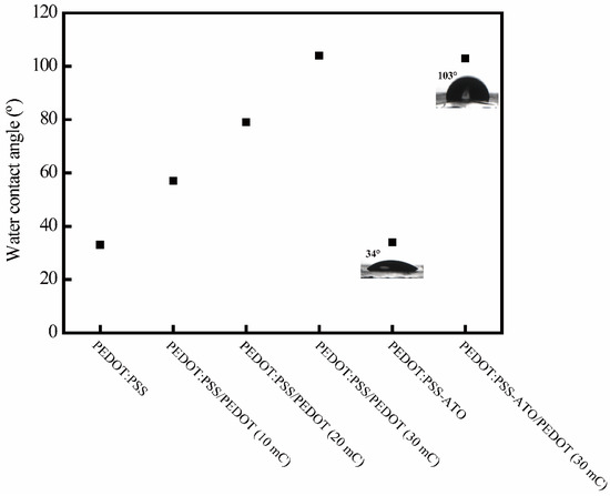 Water contact angles of PEDOT-based films and (inset) images of a droplet on the surface of PEDOT:PSS-ATO and PEDOT:PSS-ATO/PEDOT films.