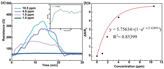 The resistance response results of PEDOT:PSS-ATO and PEDOT:PSS-ATO/PEDOT films exposed to different concentrations of HPV are shown in Figures S2 and S4. It was found that the overall trend of the resistance–time response (Figure S2a) of the PEDOT:PSS-ATO film was similar to that of the PEDOT:PSS film [26]. Once exposed to HPV, the film’s resistance changed rapidly within seconds and rose quickly from the initial values (~97 Ω, slightly higher than that of the pristine PEDOT:PSS film (~87 Ω)) to 102 Ω [26]. The weak, but limited, effect of ATO on the PEDOT:PSS film’s conductivity can be ascribed to the presence of ammonium oxalate groups in its molecular structure. They interact with PSS− chains to change the degree of doping of PEDOT+ or drive the recombination of the molecular chains. Within about 5–20 min, the values were relatively high and stable. They then decreased after 5 min to a similar level to their initial values. In view of the effect of the concentrations of HPV, the resistance responses (ΔR/R0) of PEDOT:PSS-ATO films were 8.52 (10.5 ppm), 5.93 (4.0 ppm), 3.06 (1.9 ppm), and 2.28 (1.0 ppm). They reached their highest peaks at 16 min, 18 min, 18 min, and 17 min, respectively. Greater concentrations of the analyte resulted in a stronger signal contrast without a significant difference in the peak time.