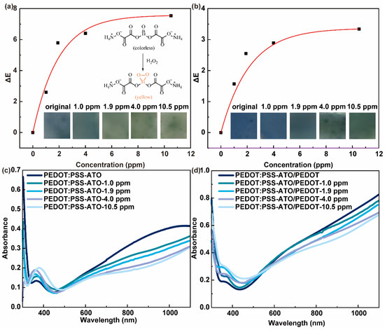 With exposure to increasing concentrations of HPV, PEDOT:PSS-ATO and PEDOT:PSS-ATO/PEDOT films showed obvious color changes from blue to yellow-green, as seen in Figure 5a,b. The data shown in Figure 5 and listed in Table 2 show the greater response (ΔE) of the colorimetric response–HPV concentration as a fitted curve. In light of the blue color in these films caused by PEDOT, the pristine PEDOT:PSS-ATO/PEDOT film showed much darker color than the PEDOT:PSS-ATO film. However, the additional polymer layer could weaken the colorimetric response due to the issues of thickness and background color. Nevertheless, by adding colorless ATO, the consequent oxidative discoloration to yellow (Figure 5a (inset)) made these films exhibit a more distinct and abundant color change than PEDOT:PSS (Figure S3a) and PEDOT:PSS/PEDOT (Figure S3b) films. These only monochromatically changed colors of blue, due to the well-known doping-driven electrical and optical mechanisms of PEDOT (Figure S1).