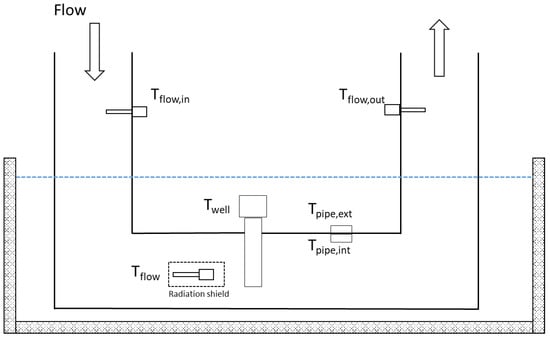 To this aim, the pipe was immersed in a thermostatic bath to keep its surface temperature constant. The fluid flow in the duct was simulated by aspirating air at ambient pressure and different velocities. Three immersion RTD (for measuring the temperature in the thermowell and those at the pipe inlet and outlet) together with two contact RTD (for measuring the external and internal surface temperatures of the pipe) were installed. The schematic in Figure 1 describes the test layout, in which is the reference temperature, i.e., the temperature measured directly in the gas stream, close to the thermowell tip, and shielded from the radiative influence of the pipe walls. After an adequate stabilization time and the achievement of a steady state inside the pipe, temperature data in the six positions indicated in Figure 1 were gathered.
