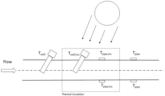 In the period from September 2019 to September 2020, data from the fiscal measuring system of the TSO (i.e., volume, pressure and temperature of the gas flow, ) have been analyzed, together with temperature data from sensors specifically installed on the external surface of the pipeline and in a thermowell mounted in an insulated portion of the pipe, , and close to the fiscal one. Hourly ambient temperature and solar radiation data for the specific experimental campaign site was also analyzed []. Unfortunately, since a shielded sensor installed directly in the gas stream in the proximity of the thermowell was not available due to regulatory constraints [], the reference temperature of the gas stream, , was obtained through the model described in Section 2.2. In this case, since the developed model has been successfully validated in the range of the experimental runs, the calculated could be considered reliable. Figure 3 presents a sketch of the sensors’ layout.