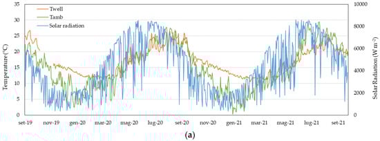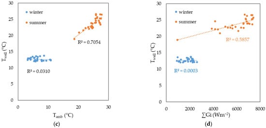 The results of the correlation analysis of the measured with the average daily ambient temperature and the daily cumulated solar radiation have been reported in graphs in Figure 5c,d. First, it can be pointed out that is not correlated with either or in the winter regime. However, in the summer regime, a non-negligible positive correlation of is demonstrated with both (i.e., correlation coefficient R = 0.84) and (i.e., R = 0.76).